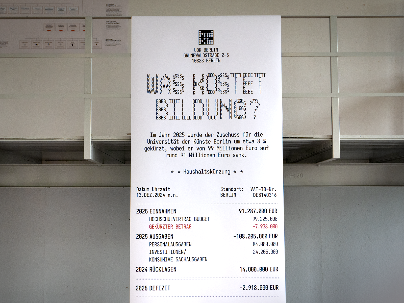 Komplexe Systeme wie die Haushaltsplanung von Universitäten sind oft schwer zu verstehen. Dieses Projekt übersetzt diese Komplexität in ein zugänglicheres Format, indem es die vertraute Struktur eines Kassenbons verwendet. Informationen, die normalerweise in Tabellen und Verträgen verborgen sind, werden durch ausgewählte Fakten und Zahlen sichtbar gemacht. Das übergroße Format lenkt die Aufmerksamkeit auf Dinge, die sonst leicht übersehen werden. Ein Kassenbon, gewöhnlich ein Wegwerfprodukt, wird so zum Medium, um institutionelle Strukturen greifbarer zu machen.